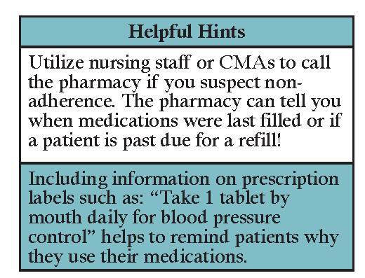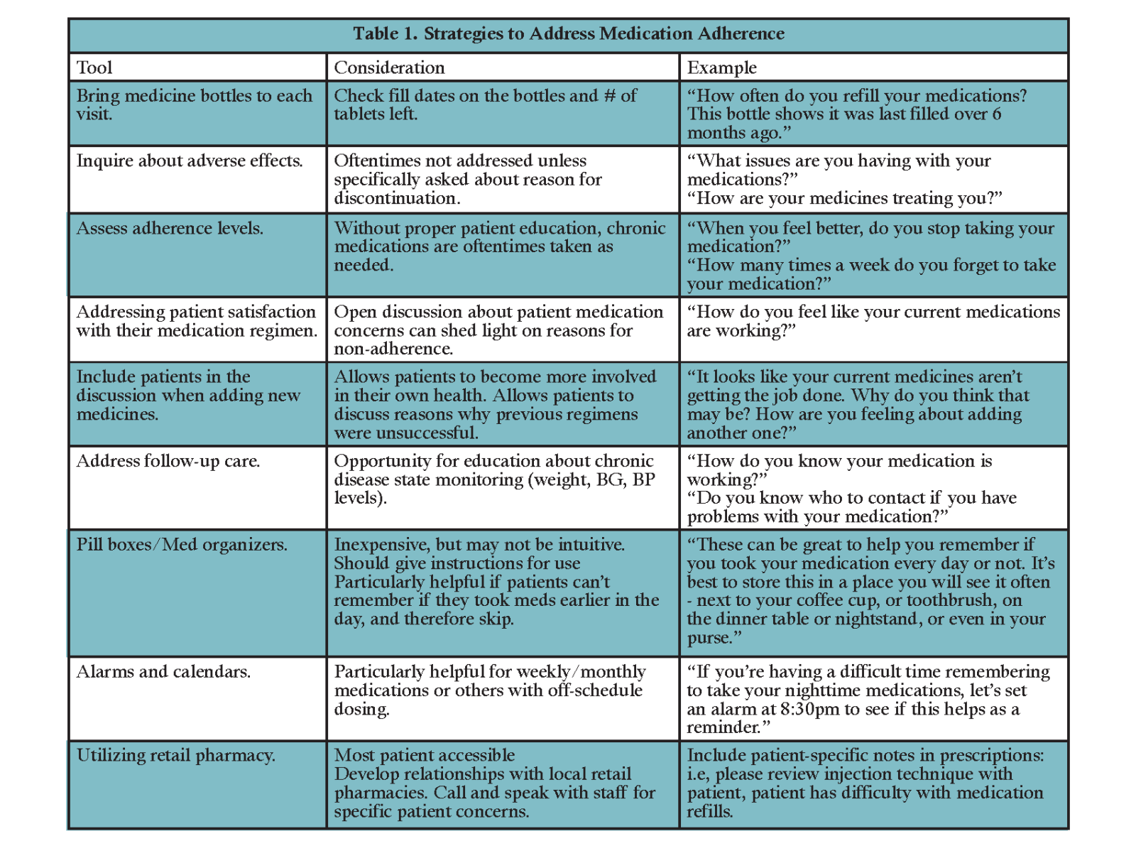 Several barriers to medication adherence exist. These may include cost, lack of transportation to the pharmacy, adverse effects, and complexity of medication regimen. Rather than addressing medication concerns when prompted by the patient, strategies (Table 1) can be used during patient encounters to discuss adherence at each visit.