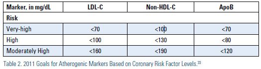 Based on the most recent statin clinical trials, Sniderman, Williams, Contois, et al.32, in 2011, suggested that in patients at 'very high risk,' the ApoB target should be <70 mg/dL, with no lower limits. They suggested for those patients at ‘high risk’ an appropriate ApoB target should be <80 mg/dL and for the ‘moderately high risk’ patients, the ApoB target would be <120 mg/dL. For non-HDL-C the targets are <100mg/dL, <130 mg/dL and <190 mg/ dL, respectively; and for LDL-C <70mg/ dL, <100 mg/dL and <160 mg/dL, respectively (Table 2).