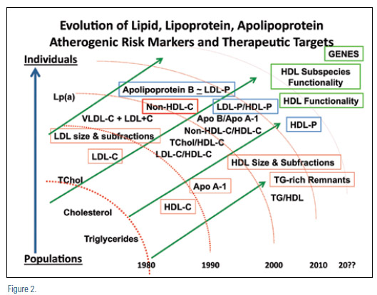 Assessment of individuals at risk has evolved from simple lipids (cholesterol and triglycerides) to lipoproteins (predominantly VLDL-C, LDL-C, and HDL-C), to lipoprotein size determinations, to surrogates of atherogenic cholesterol (non-HDL-C), to lipoprotein-associated apolipoproteins (predominantly ApoB and ApoA1), and to LDL particle numbers (as LDL-P or ApoB), as well as non-lipid biomarkers and imaging assessments. There is recent evidence to suggest that increased HDL particle number (HDL-P) is a better measure of cardiovascular risk than HDL-C.47 This raises the possibility that when therapies increase HDL-P, regardless of changes in HDL-C, HDL functionality, such as macrophage cholesterol efflux, or other beneficial properties attributable to HDL, might also improve.42 In this regard, at least as monotherapy, fibrate benefit was associated with both increased HDL-P and reduced LDL-P, in the low-HDL targeted VA-HIT trial population.48