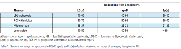 Familial hypercholesterolemia (FH) is a disease caused by autosomal dominant defects in the genes coding for the lowdensity lipoprotein (LDL) receptor, apolipoprotein (Apo) B, or proprotein convertase subtilisin/kexin type 9 (PCSK9).1 It is the most common single gene lipid disorder. FH is characterized by severely elevated blood cholesterol concentrations. Xanthelasmas, tendon xanthomas, tuberous xanthomas, and corneal arcus may be evident upon physical examination of FH patients.1 Homozygous FH is rare, occurring in about one of every million persons. Heterozygous FH is more common, occurring in one of every 300-500 people, and in some founder communities the incidence may be as high as one in 50 to 100 persons.1 More than 10 million people worldwide have some form of FH. Homozygotes have much higher cholesterol levels [total cholesterol (-C) typically in the range of 650-1000 mg/dL] and earlier onset of coronary artery disease than heterozygotes, who typically have total-C in the range of 350-550 mg/dL.1 Although many patients with heterozygous FH respond well to high-dose statins, ezetimibe, and bile acid sequestrants, management of homozygous FH patients is especially difficult due to the magnitude of LDL-C reduction that is needed, and because many homozygotes are refractory to statins, the mechanism of action of which depends mainly on up-regulation of hepatic LDL receptors. Several therapies are available, or in development, for the treatment of FH. In this article, we will briefly describe LDL-apheresis, PCSK9 inhibitors, mipomersen, and lomitapide, largely reflecting a summary of presentations given in a session on emerging therapies for LDL-C at the 2012 National Lipid Association Annual Scientific Sessions.2
