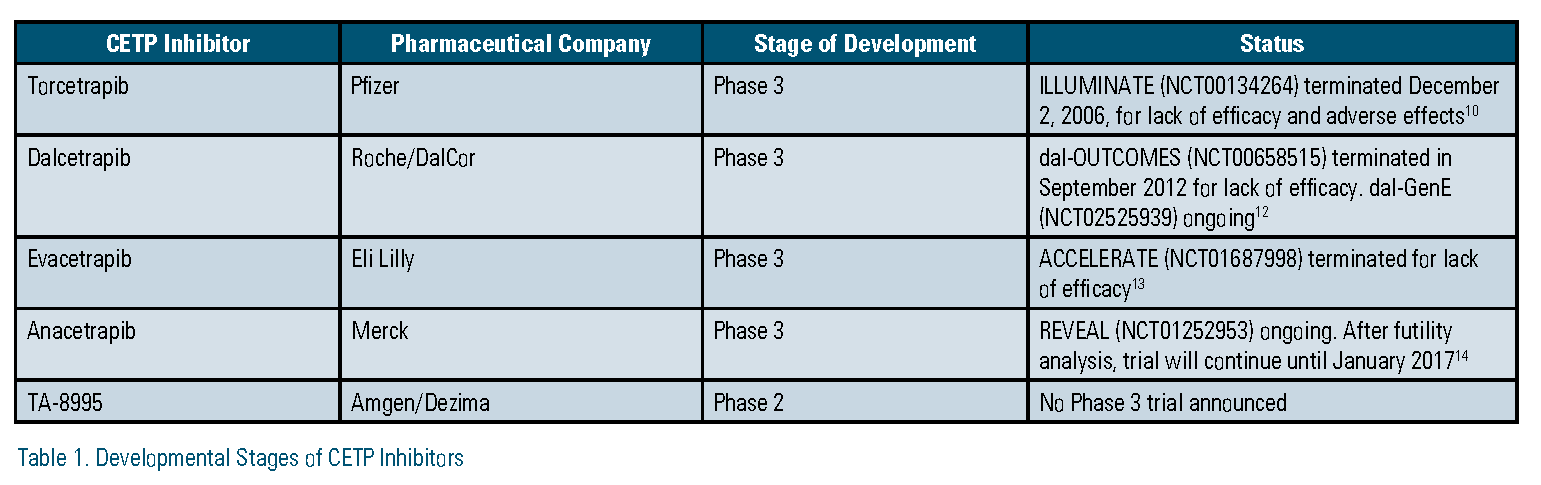 Pfizer developed and tested the first CETP inhibitor, torcetrapib. In the Phase 3 Investigation of Lipid Level Management to Understand Its Impact in Atherosclerotic Events (ILLUMINATE) trial, patients treated with torcetrapib had significantly higher rates of major cardiovascular and cerebrovascular events, and higher mortality resulting from cancer and infection.10 The trial, and all further development of torcetrapib, was terminated in December 2006. It is largely accepted that off-target effects on cortisol, endothelin-1, and aldosterone led to the observed adverse outcomes.11 Dalcetrapib, developed by Hoffman-La Roche, followed torcetrapib. In the Phase 3, Dalcetrapib in Stable Coronary Heart Disease Patients with Recent Acute Coronary Syndrome (dal-OUTCOMES) trial, treatment with dalcetrapib did not alter the risk of major cardiovascular events.12 The study was stopped early based on a futility analysis and Roche discontinued development of dalcetrapib in May 2012. In other studies, it was shown that dalcetrapib did not have any off-target adverse effects; however it did not have any appreciable effect on LDL-C, which was the major reason cited for the negative results. Eli Lilly recently halted development of evacetrapib in October 2015, after a planned interim analysis of its Phase 3 Aliskiren and the Calcium Channel Blocker Amlodipine Combination as an Initial Treatment Strategy for Hypertension (ACCELERATE) trial also demonstrated insufficient efficacy. Results of the study were presented at the 2016 American College of Cardiology Scientific Sessions and publication of the full results are expected this year. Evacetrapib had no off-target effects, decreased LDL-C by 37 percent, and increased HDL-C by 130 percent, yet did not decrease atherosclerotic cardiovascular events in more than 12,000 high-risk patients.13 No reasons for the negative results of evacetrapib have yet been hypothesized.
