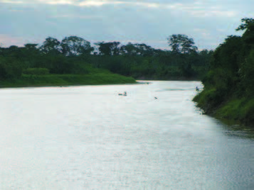 Figure 1. Tsimane man crossing the Maniqui River in a dugout canoe.