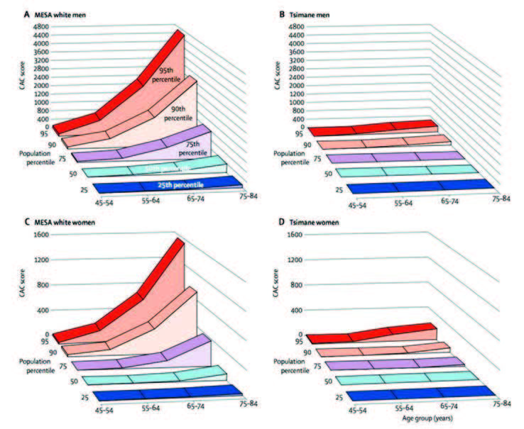 Figure 2. CAC score by age and CAC percentile in MESA white men (A) and Tsimane men and in MESA white women (C) and Tsimane women (D). Adapted with permission from Kaplan H, Thompson RC, Trumble BC, et al. Coronary atherosclerosis in indigenous South American Tsimane: a cross-sectional cohort study. The Lancet. 2017;389(10080):1730-1739.