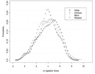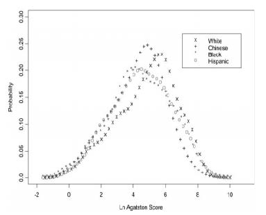 Figure 4 shows the distribution of CACS among men (left panel) and women (right panel) with detectable calcification. There is a shift to the right among white individuals relative to the other ethnic groups, which indicates generally higher scores in whites. Similarly, white individuals had the highest prevalence (44.6%), followed by Chinese (41.9%), black (36.5%), and Hispanic individuals (34.9%). These findings are similar between men and women.19