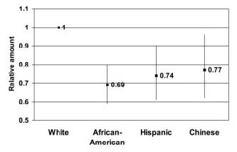 Figure 5 shows relative coronary calcium amount (in Agatston units) by ethnicity compared with white, among those with detectable calcification. 95% confidence intervals shown, adjusted for age, gender, education, body mass index, LCL cholesterol, triglycerides, smoking, hypertension, diabetes, reported treatment for high cholesterol, and center. After adjustment for the above factors, CACS relative to whites were lower in blacks (69% that of whites, 95% CI 59% to 80%), Hispanics (74% that of whites, 95% CI 61% to 90%), and Chinese (77% that of whites, 95% CI 62% to 96%).19