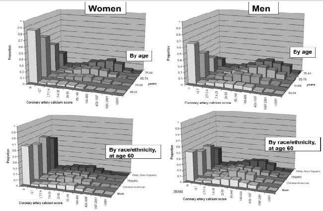 Figure 2 shows the distribution of coronary artery calcium (CAC) scores among women and men by age and race or ethnicity. The distributions of log-transformed CAC scores were approximately normal and the CAC scores correspond to Ln(CAC) scores of < 1, 1-2, 2-3, 3-4, 4-5, 5-6, 6-7, 7-8, and > 8. The first bar in each graph represents individuals with no detectable CAC (and an undefined Ln(CAC) value). Age, gender, and race or ethnicity are strong predictors of the presence and extent of CAC.14