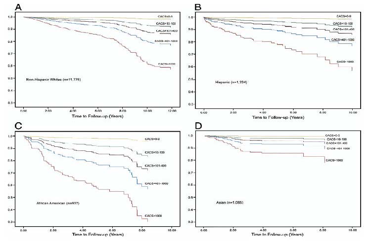 Figure 3 shows the survival ranges for various ethnic groups. Using risk-stratified Cox proportional hazard survival analyses, survival for non-Hispanic whites ranged from 98% to 57% for CACS of 0 to 10 to greater than or equal to 1,000. Survival ranged from 97% to 30% in African Americans, 99% to 60% in Hispanics, and 100% to 80% in Asians for CACS of 0 to 10 to greater than or equal to 1,000. Using this model, CACS remained predictive of death in a model controlling for age and risk factors in all ethnic subsets (p < 0.0001). For subset multivariable models, CACS was predictive of death for non-Hispanic whites (p < 0.0001), Hispanics (p < 0.0001), African Americans (p < 0.0001), and for Asians (p < 0.002), respectively. In addition, in a stepwise model, the CACS was identified as the single greatest estimator of time to mortality for each ethnic subset.18