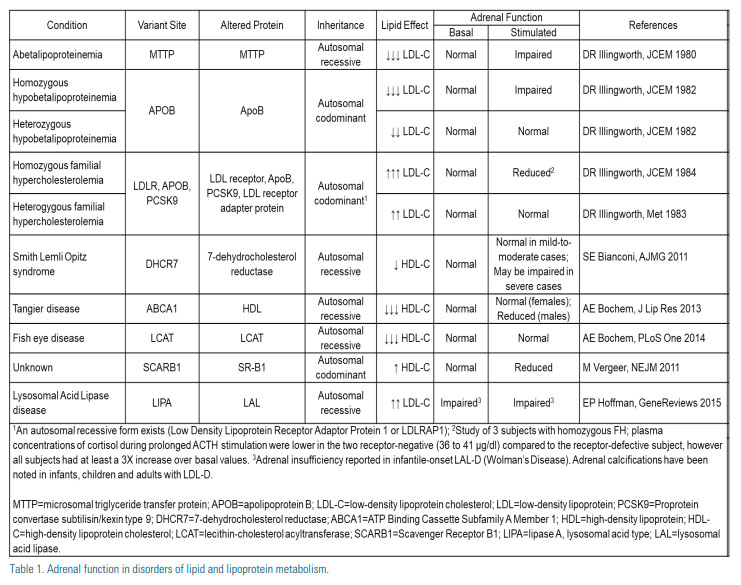 The importance of the LDL receptor pathway in adrenal cells is highlighted by the observation that individuals with absent or near absent circulating levels of LDL-C (i.e., homozygous hypobetalipoproteinemia and abetalipoproteinemia) have been reported to have impaired adrenal function (Table). (5, 6) It is unclear, however, if adrenal impairment in these conditions is due to lack of intracellular cholesterol – as alternate compensatory mechanisms exist – or the result of alteration of cellular structure/function in the setting of absent or near absent levels of circulating LDL-C. Support for the latter includes observations of those with low but not absent or near absent levels of circulating LDL-C (i.e., heterozygous hypobetalipoproteinemia) maintain normal adrenal function.(5)