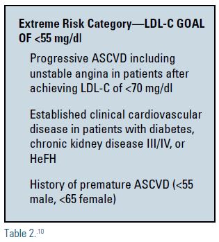 Indeed, the most recent guidelines from the American Association of Clinical Endocrinologists advocates a new LDL-C goal of <55 mg/dL in patients who are at highest risk, including diabetics with established clinical ASCVD, as well as those with chronic kidney disease, heterozygous familial hypercholesterolemia, and premature ASCVD (see Table 2).10 I am happy to embrace this new extreme-risk category and I believe it underscores the concept that lower is better.