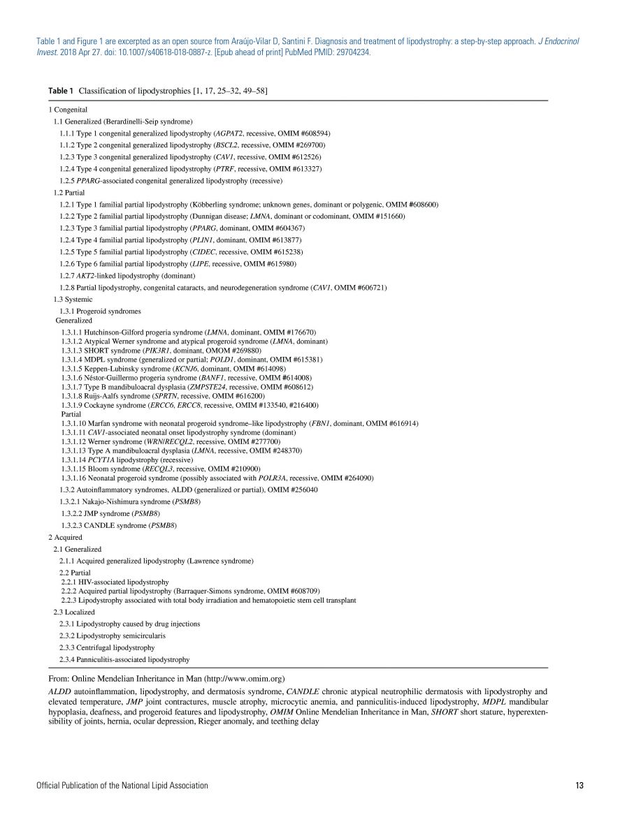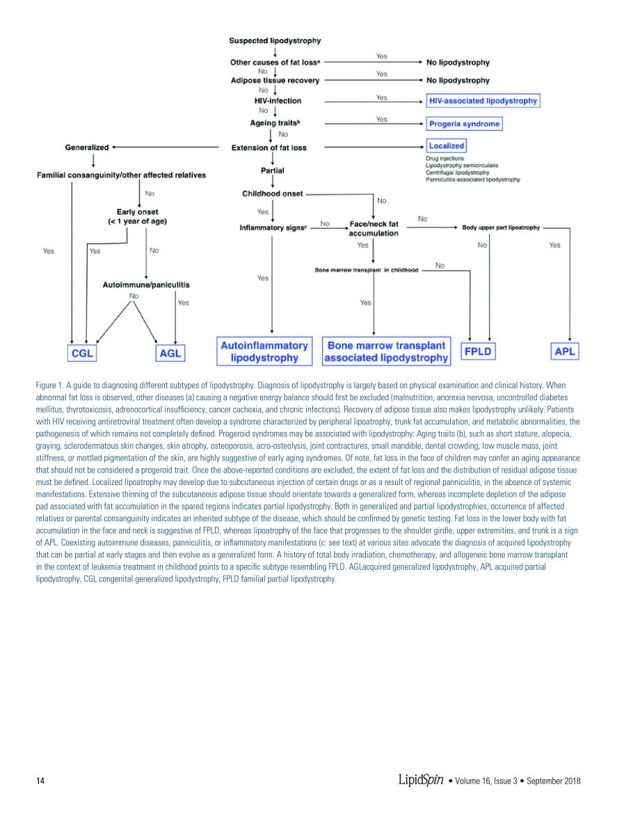 Lipodystrophies are a group of disorders of fat tissue loss that are classified according to whether the condition is genetic or acquired and by the distribution of fat loss, either generalized or partial (Table 1).1 Generalized lipodystrophy is a rare, complex, and clinically heterogeneous disorder characterized by the widespread loss of adipose tissue. Patients appear lean and muscular because muscle definition is often obvious due to absence of subcutaneous fat. Counterintuitively, the metabolic sequelae of this lipodystrophy subtype are often the most severe. Lipodystrophy is often associated with premature mortality due to cardiovascular disease, liver disease, kidney failure, pancreatitis, and/or sepsis. Other comorbidities may accompany this condition as well. This includes physical disfigurement and associated psychosocial stress, peripheral neuropathy, foot and other skin infections due to neuropathy, loss of fat pad on both feet, and inconsolable hunger in the case of generalized lipodystrophy with absent leptin. Because the rarity of certain subtypes, lipodystrophy may frequently go unrecognized.2 Araújo-Vilar and Santini have described the clinical presentation of known types of lipodystrophy and organized them into a diagnostic algorithm. (Figure 1).1 Fortunately, genes associated with many congenital forms of lipodystrophy have been identified and genetic testing may assist both in confirming the diagnosis of lipodystrophy and in identifying the subtype of this disorder.