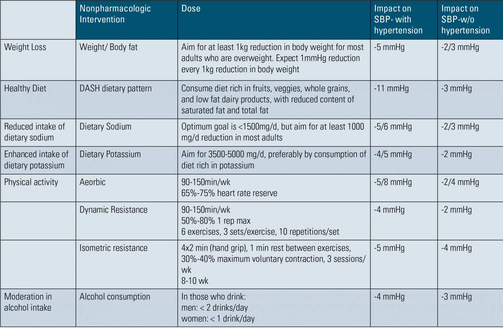 Lifestyle modification alone is a Class I recommendation for those with elevated BP and Stage 1 hypertension with low (<10%) atherosclerosis cardiovascular disease (ASCVD) risk and in all those requiring antihypertensive drug therapy. The following are Class IA recommendations for nonpharmacological interventions in reducing BP: weight loss (when appropriate); adherence to a heart-healthy diet, such as the Dietary Approaches to Stop Hypertension (DASH) diet; sodium reduction; potassium supplementation (unless contraindicated by the presence of chronic kidney disease or hyperkalemia); increased physical activity; and limiting alcohol consumption to no more than 1 or 2 drinks a day for women and men, respectively (Table 1). These nonpharmacologic interventions may be sufficient to prevent hypertension or achieve goal BP levels for those with Stage 1 hypertension.