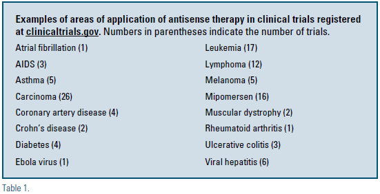 In principle, the messenger RNA (mRNA) of any gene can be blocked with antisense technology, but there are numerous technical hurdles that must be surmounted to produce an efficacious and welltolerated pharmaceutical agent that can reach the target organ and successfully bind and block the target mRNA. Although the realm of antisense development dates back several decades, the first antisense drug in clinical use, fomivirsen (Vitravene), was not FDA-approved for treatment of cytomegalovirus (CMV) retinitis in immunocompromised patients until 1998. The second antisense drug in clinical use, mipomersen (Kynamro), was approved only last year — in January 2013 — for treatment of homozygous familial hypercholesterolemia (FH). The use of fomivirsen subsequently declined after the advent of highly active antiretroviral therapy (HAART) for treatment of (HIV) infection, which virtually eliminated the occurrence of CMV retinitis. The use of mipomersen continues.