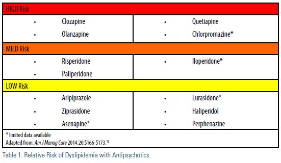While dyslipidemia appears to be a “class effect,” it is important to note there are key differences regarding the significance of dyslipidemia observed with antipsychotics (Table 1). The Clinical Antipsychotic Trials of Intervention Effectiveness (CATIE) trial10 compared the effectiveness and safety of olanzapine, perphenazine, quetiapine, risperidone, and ziprasidone. During the 18-month study, olanzapine was associated with more weight gain and greater increases in blood glucose and lipids compared to the other medications. Olanzapine and clozapine are considered to have the highest risk of metabolic adverse effects, but there is limited data on the metabolic impact of this class of medicine. Despite that, the Food and Drug Administration (FDA) required all atypical antipsychotics to carry a warning about the metabolic risks associated with this class of agents.11 As such, monitoring is recommended.