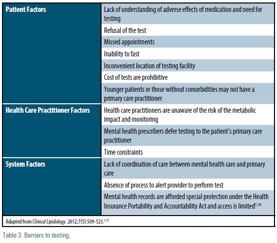 The psychiatric comorbidities of patients taking antipsychotics may make them less likely to take advantage of screening and preventive medical care in comparison with the general patient population, presenting a major barrier to identifying and treating lipid abnormalities.14 Additionally, there is limited research into the barriers of lipid profile screening in patients with serious mental illnesses. Contributing factors to testing barriers may stem from the patient, the provider, and/or system factors (Table 3).1,15 Prescribers of antipsychotics should evaluate barriers specific to their patients and practices.